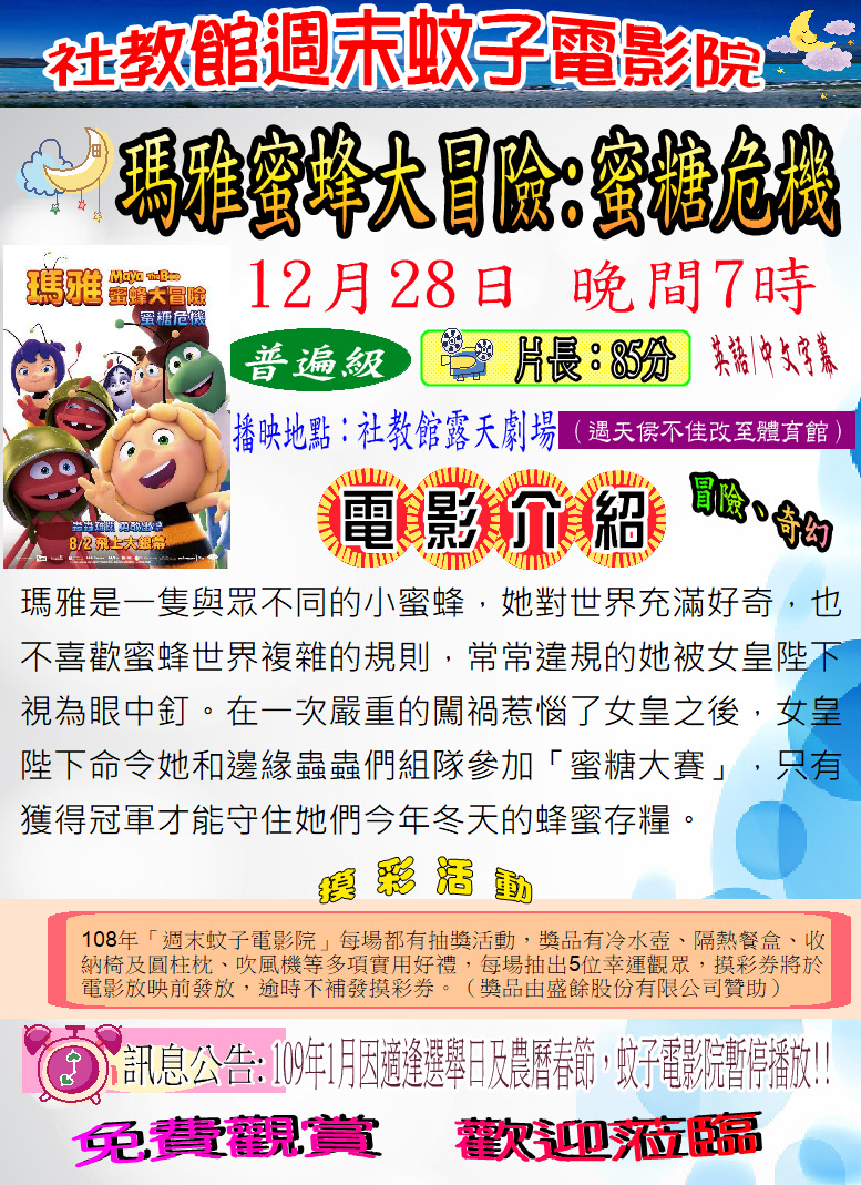 109年「週末蚊子電影院」首場播放時間為109年2月8日晚上7時,歡迎蒞臨觀賞!!
