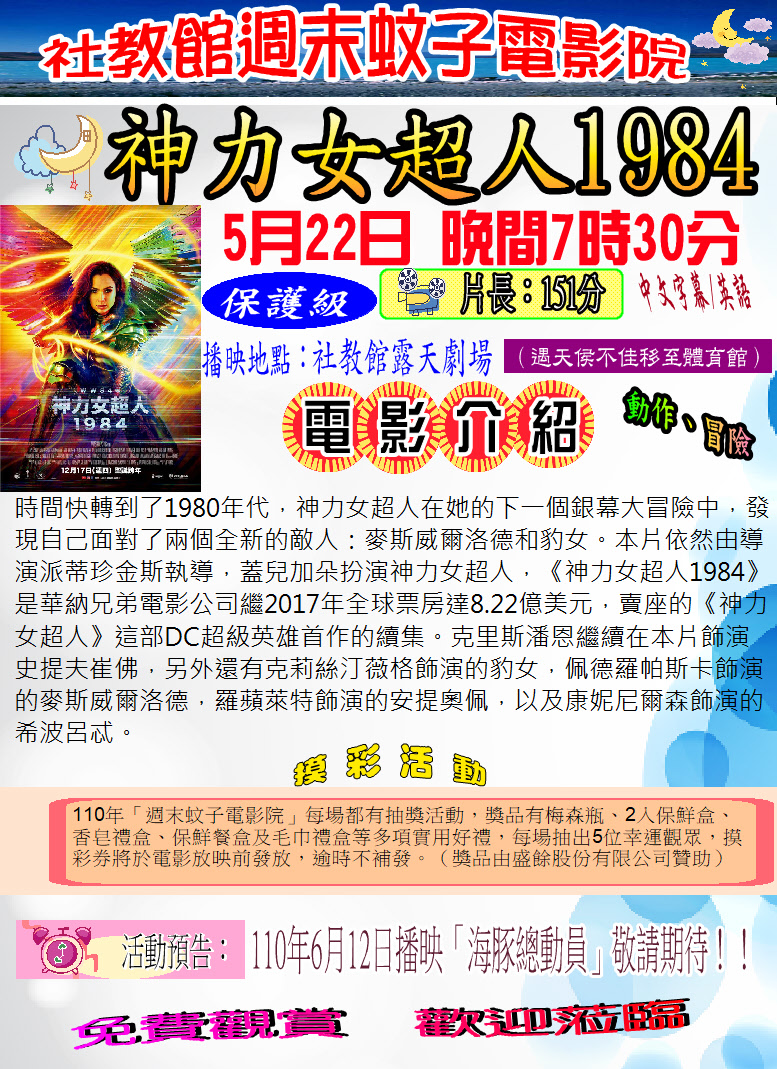 110年「週末蚊子電影院」每場都有抽獎活動,獎品有梅森瓶、2入保鮮盒、香皂禮盒、保鮮餐盒及毛巾禮盒等多項實用好禮,每場抽出5位幸運觀眾,摸彩券將於電影放映前發放,逾時不補發。(獎品由盛餘股份有限公司贊助)
