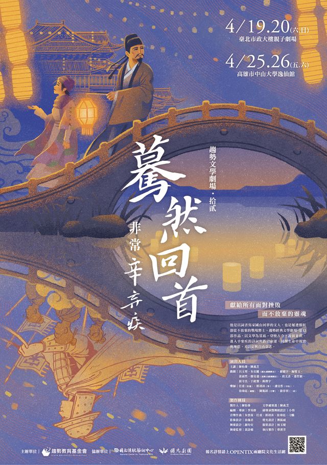 南宋詞人辛棄疾,一位以詞書寫家國山河夢的文人、一位屢遭摧折卻不向現實低頭的戰場將士。從戰場到田園,從豪放到抒情,從壯懷掙扎到與生命和解。趨勢經典文學劇場・第12部作品,陳怡蓁、陳義芝共同擔任文學講演,呂玉堃、朱安麗、蘇健宇、施璧玉、黃昶然、廖亮慈共同主演,以文學為基底,穿梭古今,說演並俱,讓我們進入辛棄疾的詩詞與跌宕命運,回探生命中現實與理想,天註定與自由意志。