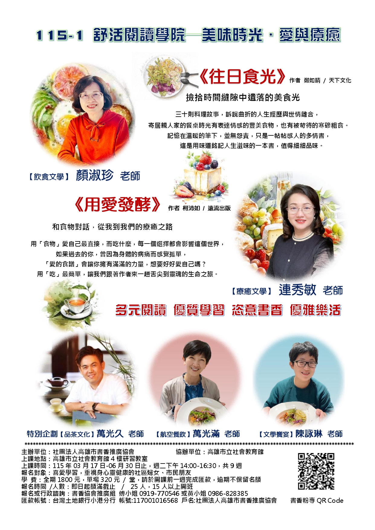 學 費:全期1800元,單堂選課320元/次,請於開課前一週完成匯款,逾期不保留名額