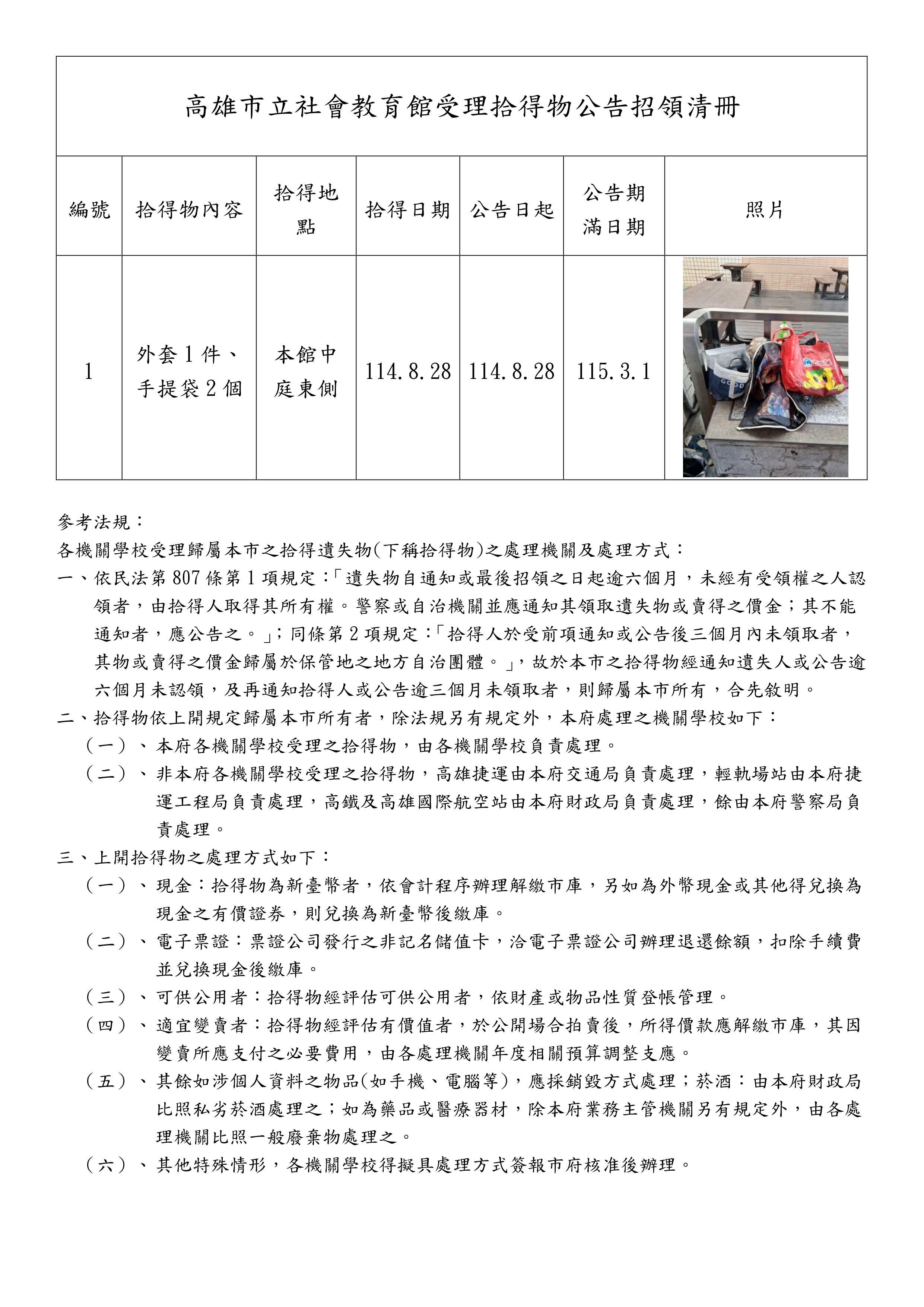 高雄市立社會教育館受理拾得物公告招領清冊