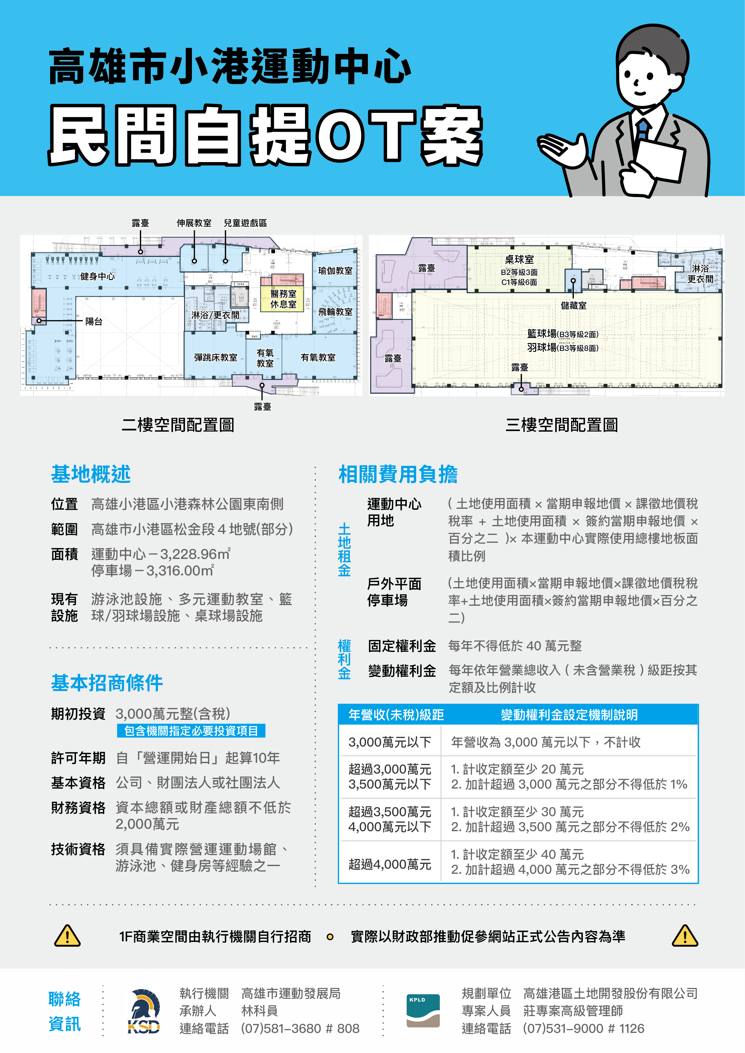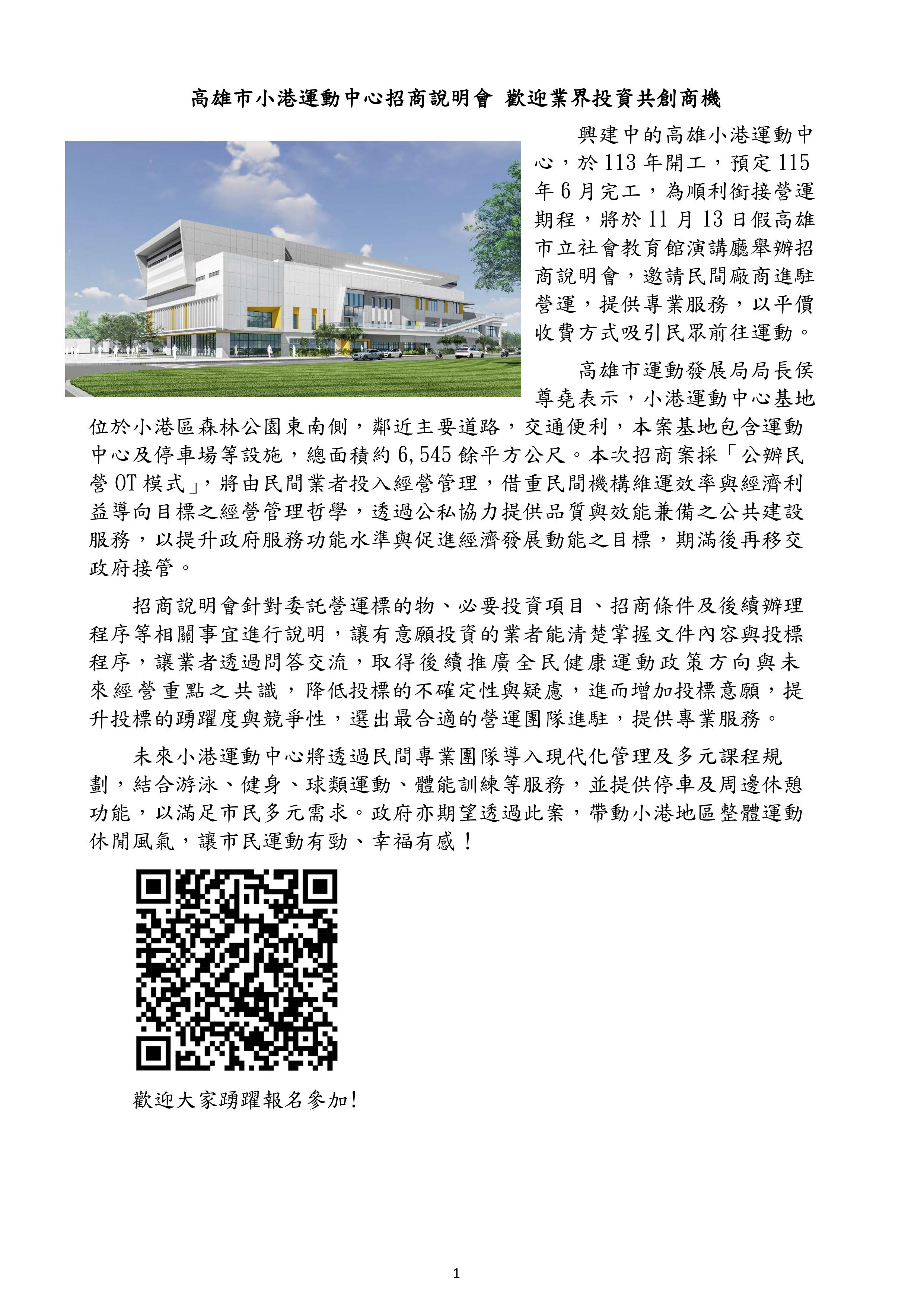 高雄市運動發展政策以「運動港都、幸福高雄」為願景,市府規劃於小港森林公園東南側打造「小港區全民運動館」,提供市民優質運動環境,帶動地方經濟與生活品質提升。本案採促參OT模式辦理,預計113年開工、115年6月完工。此次舉辦招商說明會,由運動發展局向潛在投資廠商說明案場條件、投資內容及合作模式,並廣邀業者參與,共同推動高雄運動產業發展。