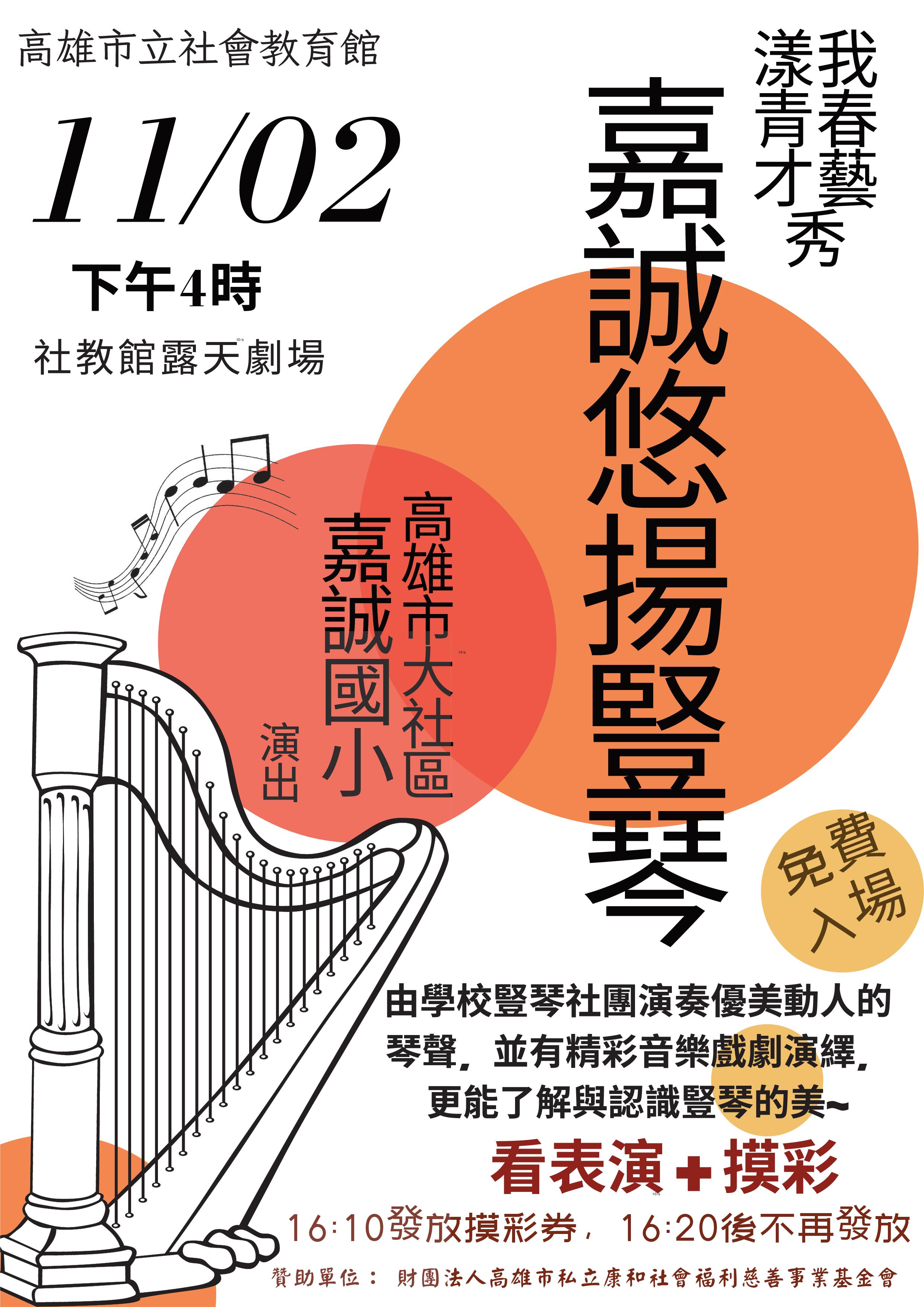 11/2漾我青春才藝秀~「嘉誠悠揚豎琴」活動由大社區嘉誠國小帶來精彩的豎琴演奏!加碼推出摸彩活動,邀您來觀賞精彩表演,試試好運氣!