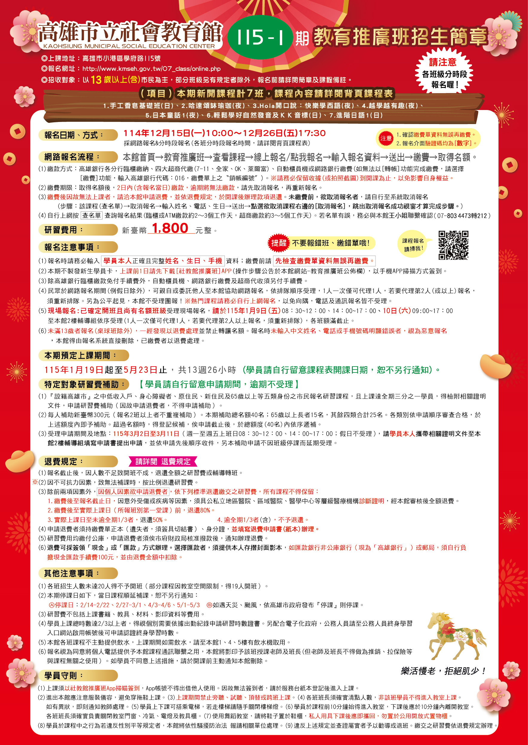 五、上課期間:預定自115年1月19日起至115年5月23日止,共13週計26小時。