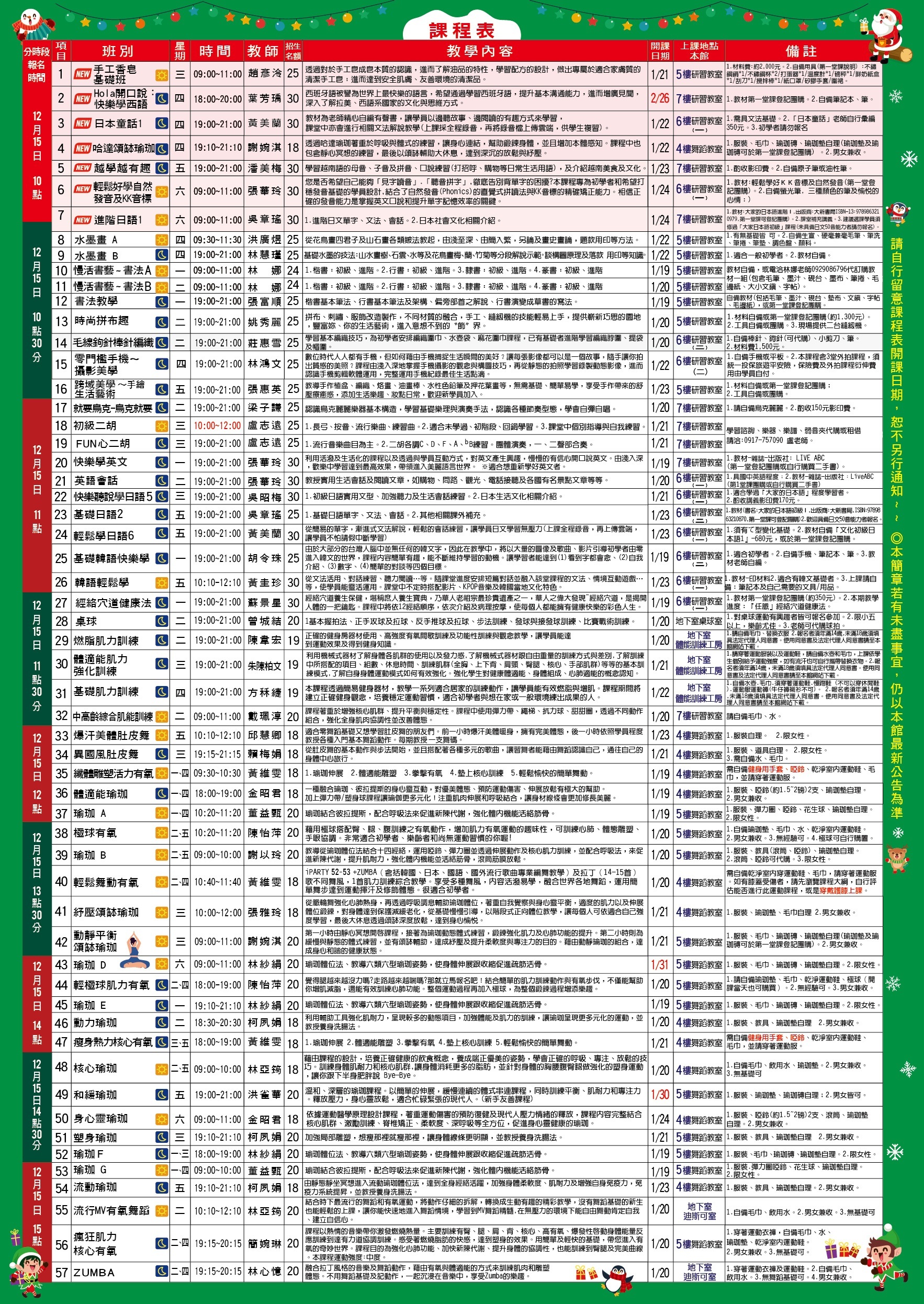 一、招生課程:毛線鉤針棒針編織、烏克麗麗、水墨畫、書法、外語(英語、韓語、日語、越南語)、二胡、拼布、手繪、手機攝影、舞蹈(肚皮舞、流行MV舞蹈)、有氧、瑜珈、肌力訓練、桌球等57個班。