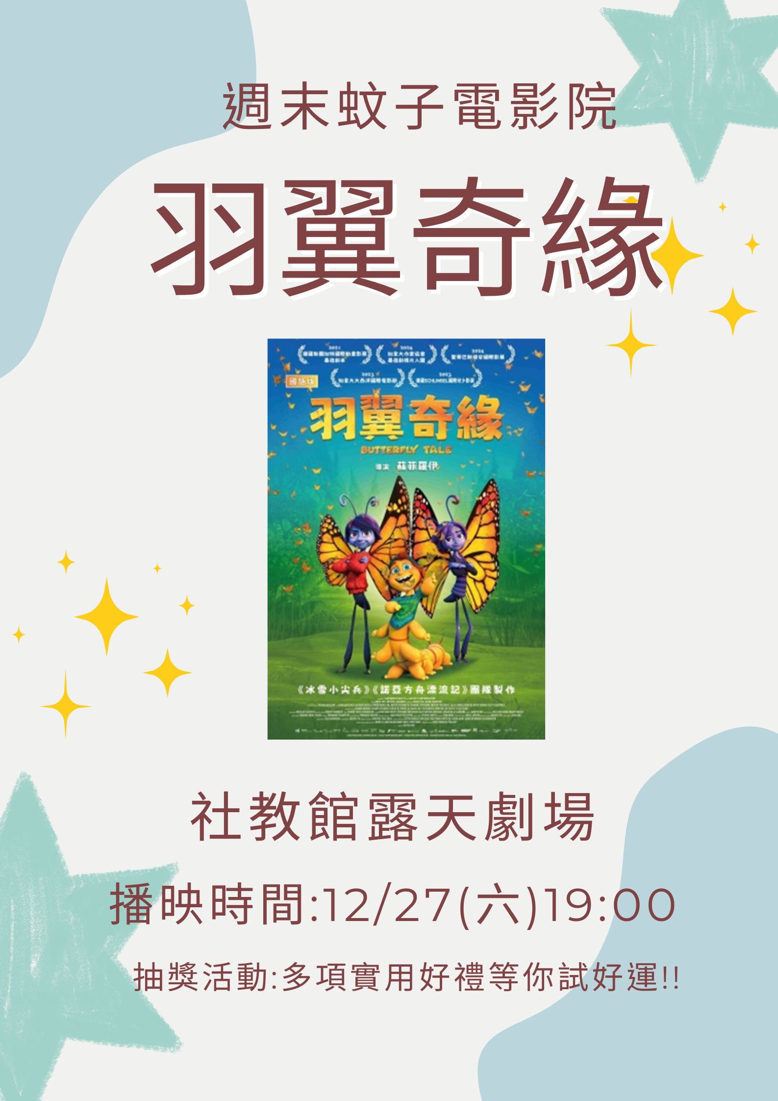 114年「週末蚊子電影院」每場都有抽獎活動,獎品有餐具組、2入玻璃保鮮盒、手提小胖叮保溫瓶、有機棉毛巾禮盒及循環扇等多項實用好禮,每場抽出5位幸運觀眾,摸彩券將於電影放映前發放,逾時不補發。(獎品由盛餘股份有限公司贊助)