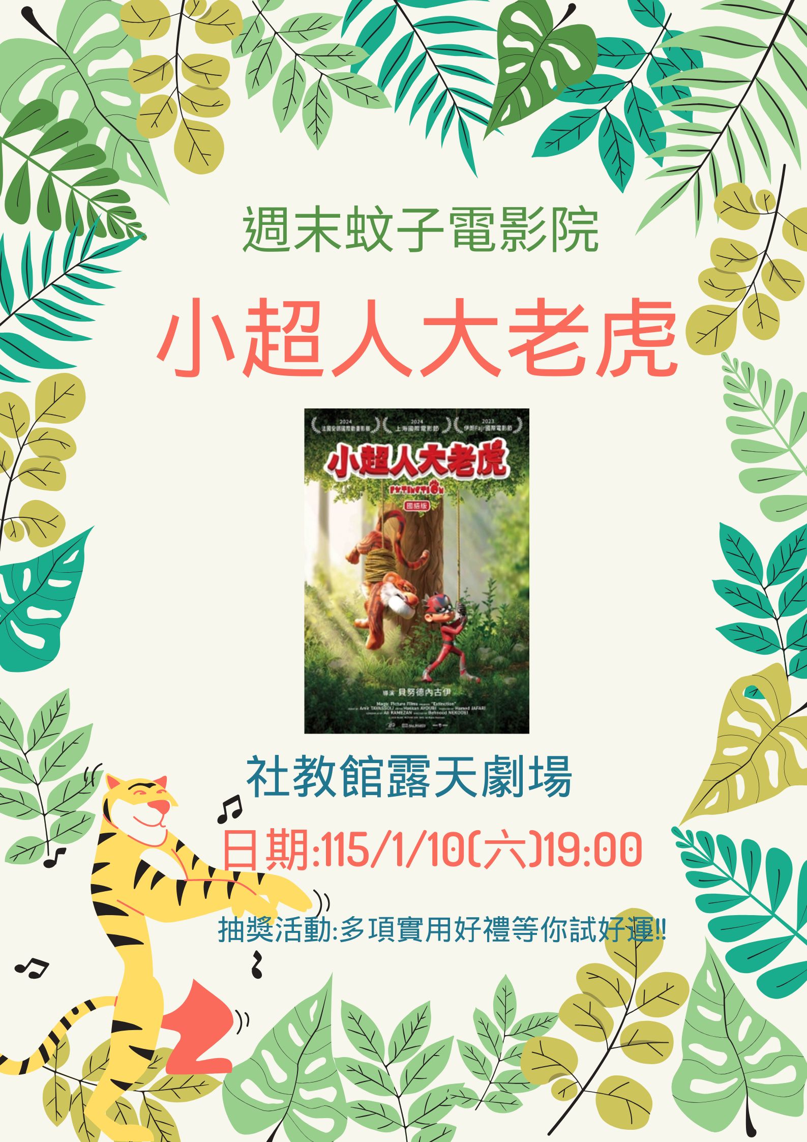 115年「週末蚊子電影院」每場都有抽獎活動,獎品有餐具組、2入玻璃保鮮盒、手提小胖叮保溫瓶、有機棉毛巾禮盒及循環扇等多項實用好禮,每場抽出5位幸運觀眾,摸彩券將於電影放映前發放,逾時不補發。(獎品由盛餘股份有限公司贊助)