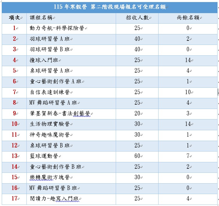 115年寒假營 第二階段現場報名可受理名額(單位:位)