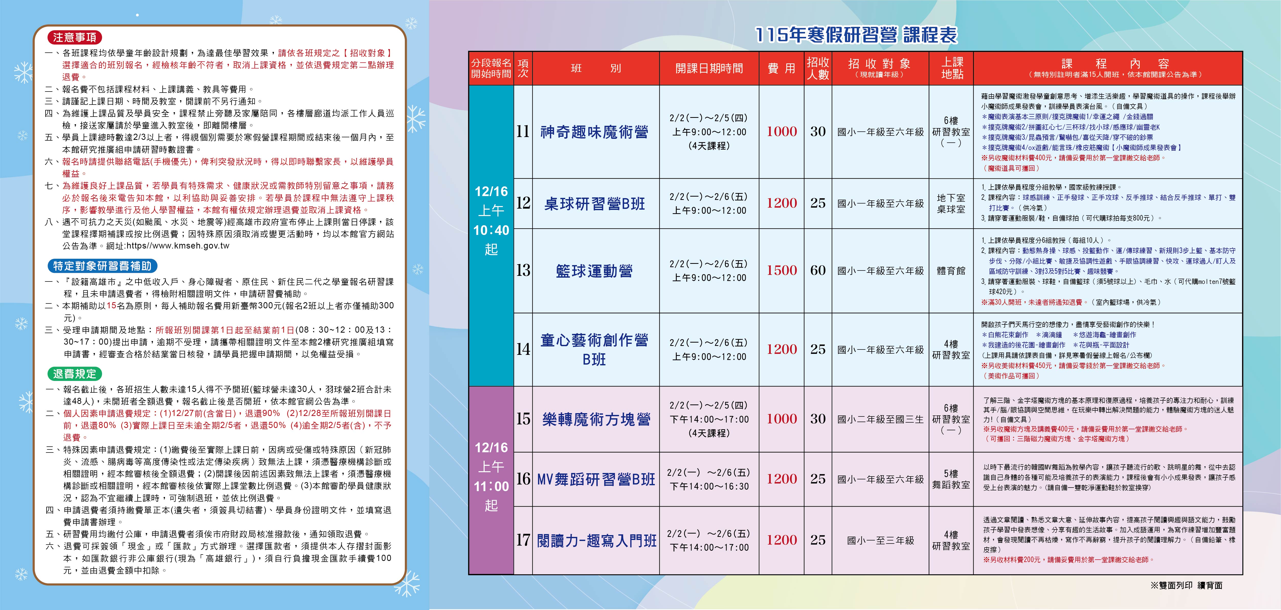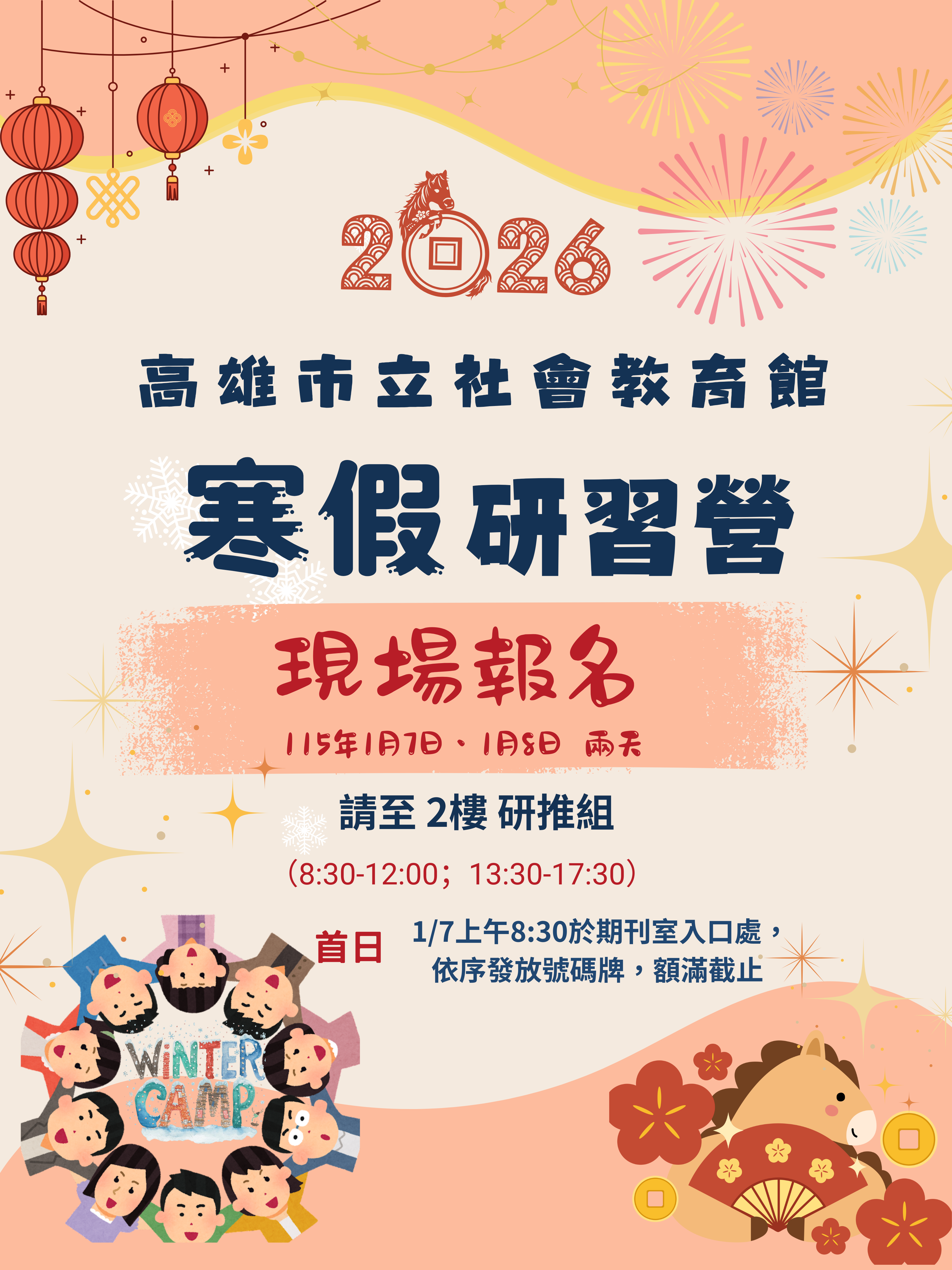 115年寒假營網路報名已截止,招生班別均開班,尚有名額的班別(詳附件),115年1月7日(三)上午8時30分起於本館2樓研究推廣組受理現場報名/繳費(依先後順序受理),名額有限,額滿提前截止,敬請把握最後機會!