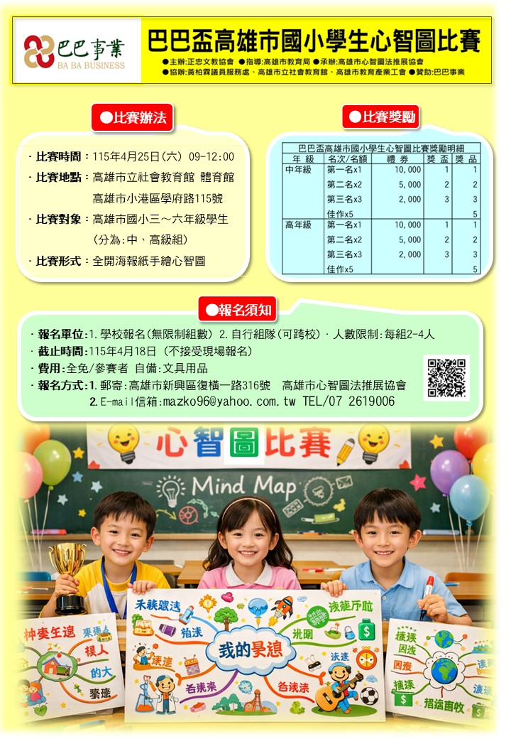 為提升高雄市國小學生「核心素養」、「理解與應用」、「自主學習」能力, 結構化思考與視覺化表達思考訓練。並強化高雄市推動閱讀教育、創新教學與數位學習的地方教育特色。舉辦「巴巴盃高雄市國小學生心智圖比賽」透過比賽形式,提升學生心智圖法學習動機。>