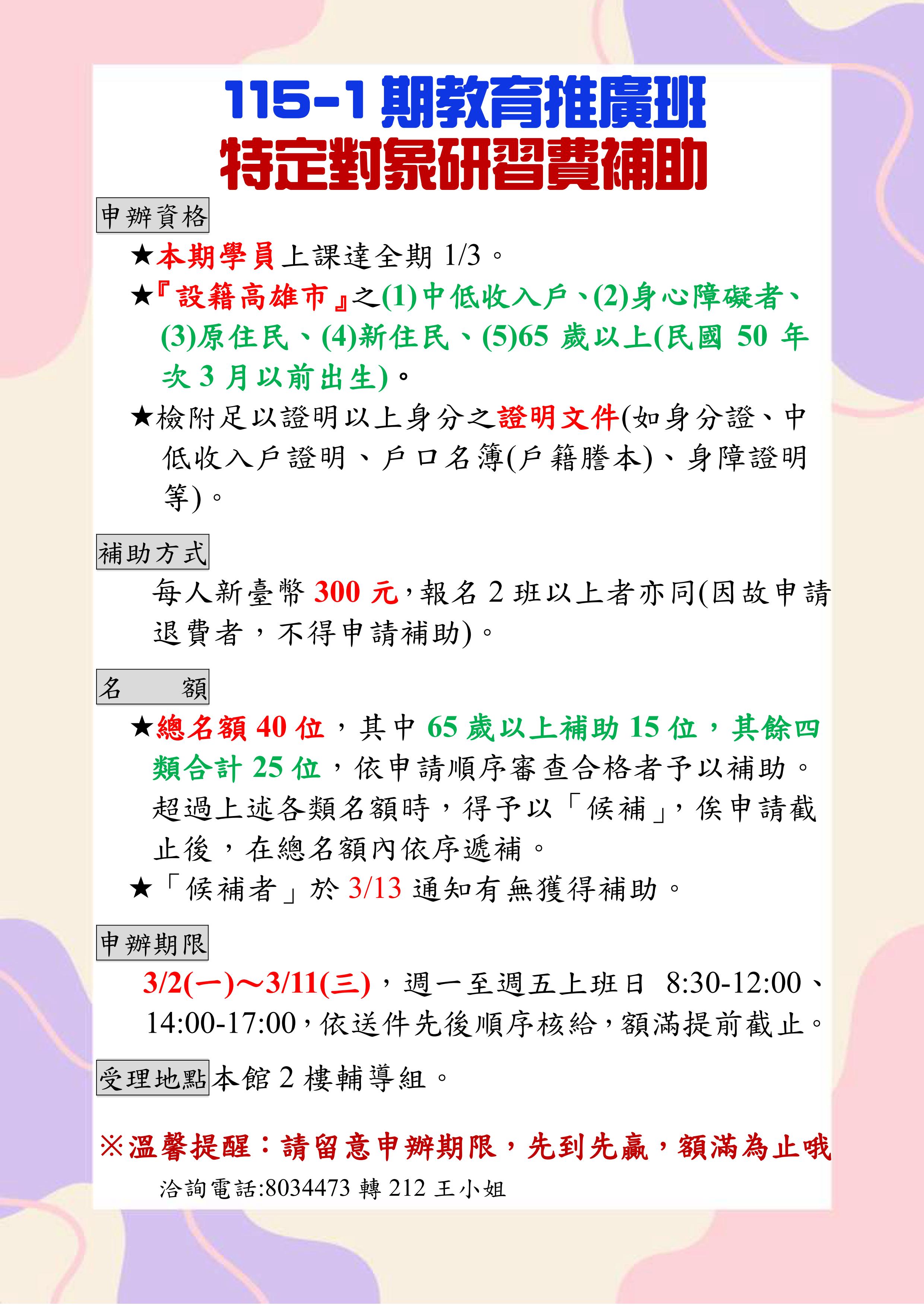 115-1期教育推廣班研習費300元補助