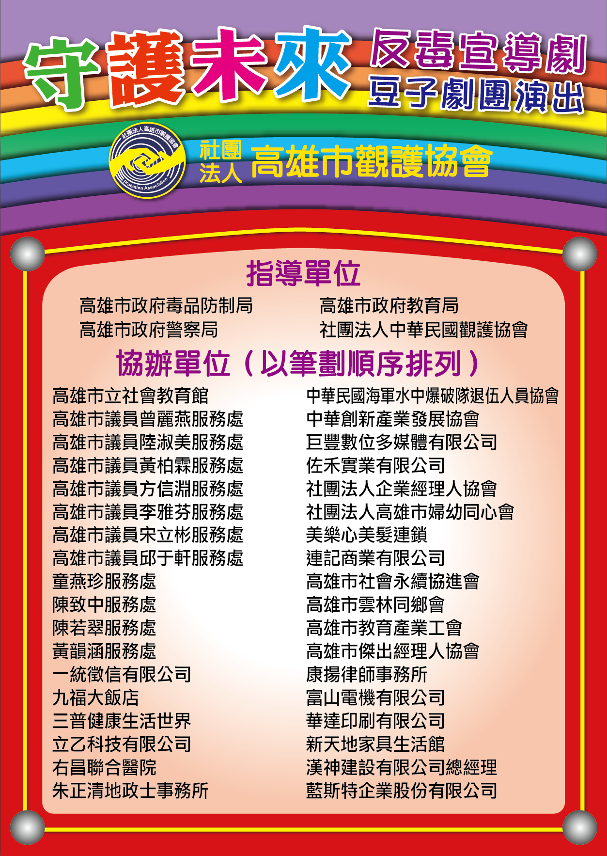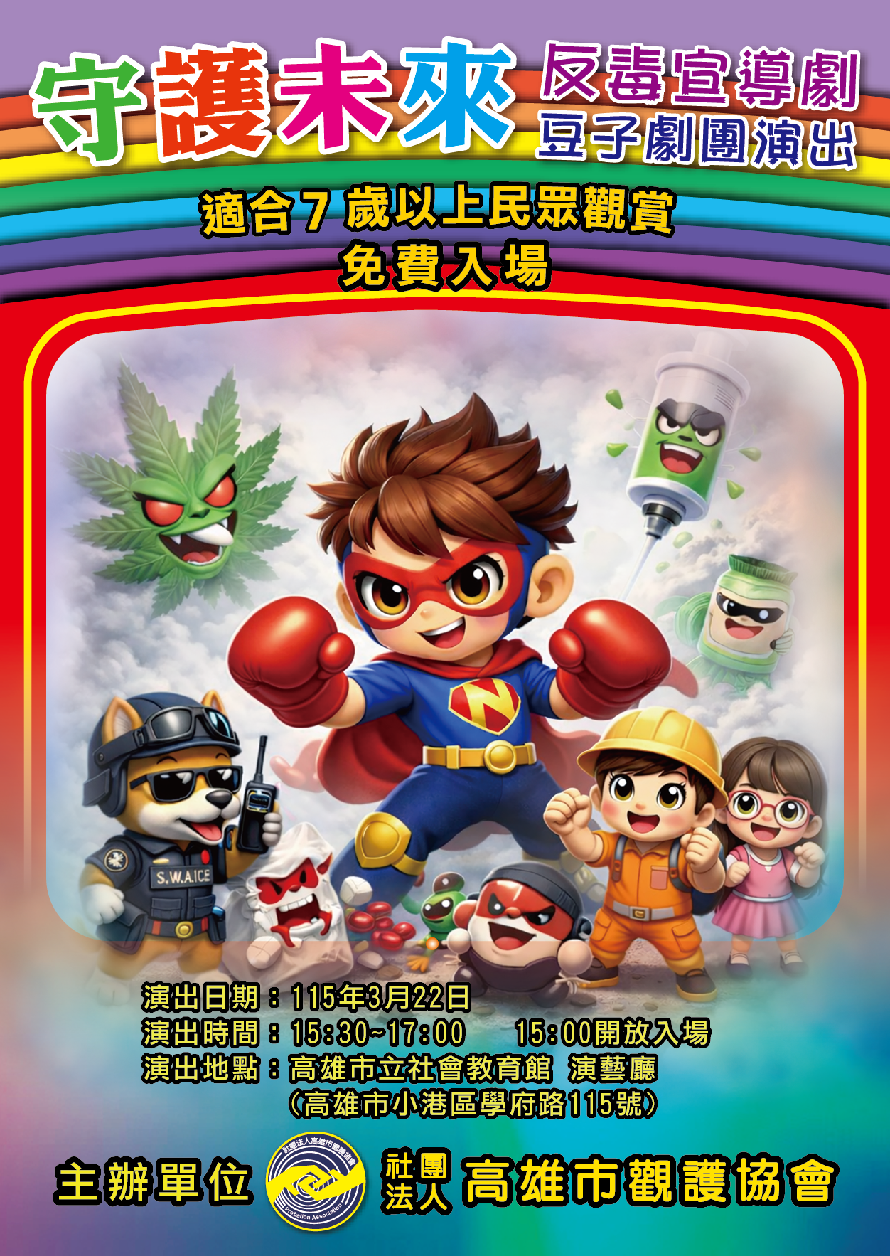 為提升青少年法治觀念與反毒意識,「社團法人高雄市觀護協會」特別辦理《守護未來》反毒宣導舞台劇,邀請專業劇團以生動活潑的戲劇演出方式,帶領大小朋友認識毒品危害,共同守護健康、安全的成長環境。