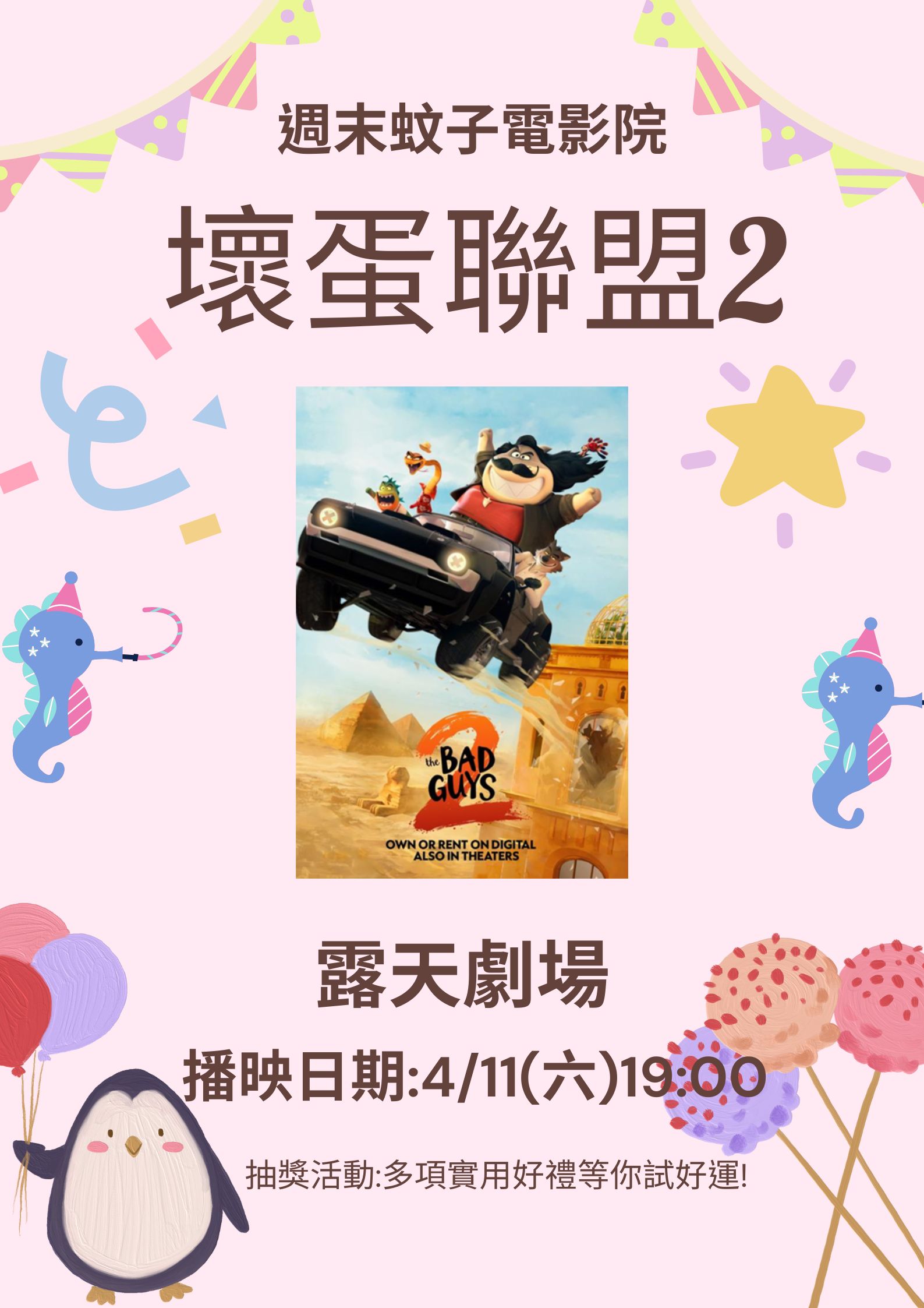 115年「週末蚊子電影院」每場都有抽獎活動,獎品有餐具組、2入玻璃保鮮盒、手提小胖叮保溫瓶、有機棉毛巾禮盒及循環扇等多項實用好禮,每場抽出5位幸運觀眾,摸彩券將於電影放映前發放,逾時不補發。(獎品由盛餘股份有限公司贊助)