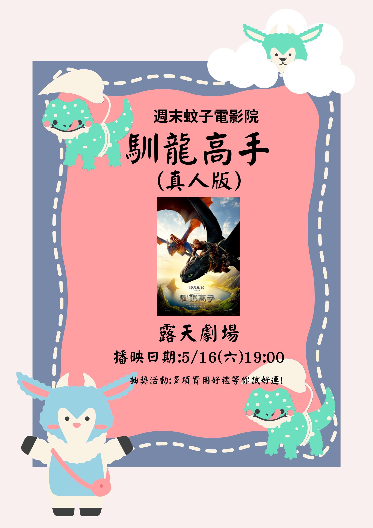 115年「週末蚊子電影院」每場都有抽獎活動,獎品有餐具組、2入玻璃保鮮盒、手提小胖叮保溫瓶、有機棉毛巾禮盒及循環扇等多項實用好禮,每場抽出5位幸運觀眾,摸彩券將於電影放映前發放,逾時不補發。(獎品由盛餘股份有限公司贊助)