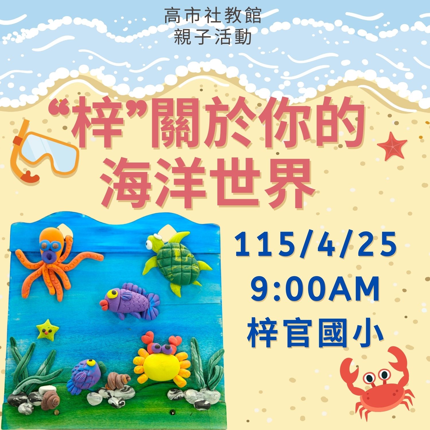 免費親子活動 ★4/25(六)9:00梓官區梓官國小【"梓"關於你的海洋世界】,用紙黏土打造專屬夢幻海底世界,尚有名額,歡迎活動當日直接現場報名,需自備:黏土工具、白膠、牙籤、剪刀、墊板或紙板、L型文件夾一個(製作黏土作品時,墊在下方用),詳見gov.tw/Wgx