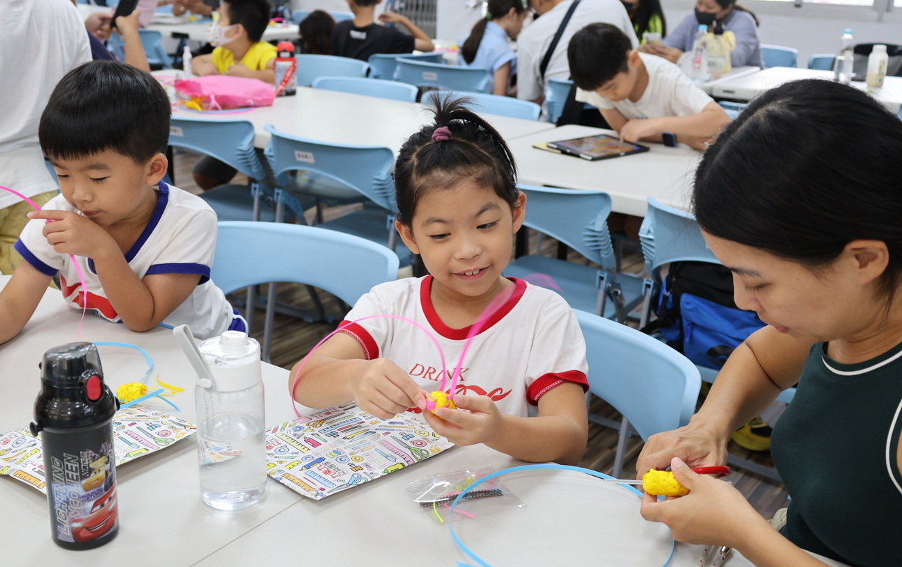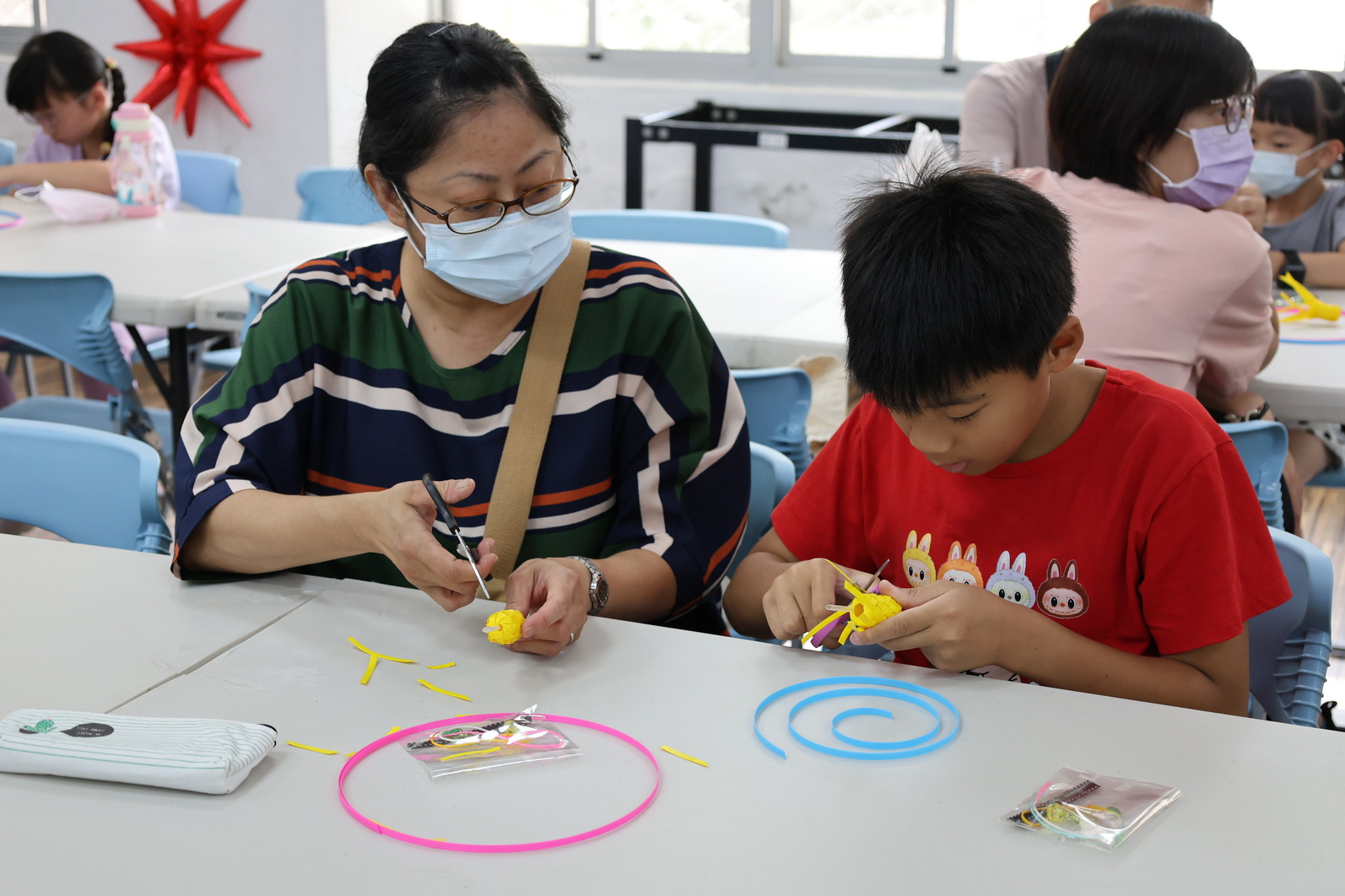 開心展示成品的洪苡家小朋友,目前就讀三民區博愛國小,他與媽媽前來參加親子活動,苡家提到這是首次接觸編織,剛開始覺得有難度,但後來越編越順手,完成作品時很有成就感;就讀鹽埕區鹽埕國小雙胞胎兄弟吳旻樺、吳旻燁,很開心能和媽媽一起完成編織作品;同校的王宥心小朋友認為今天活動很好玩,之後會想再參加其他活動。