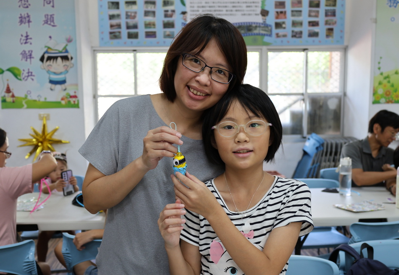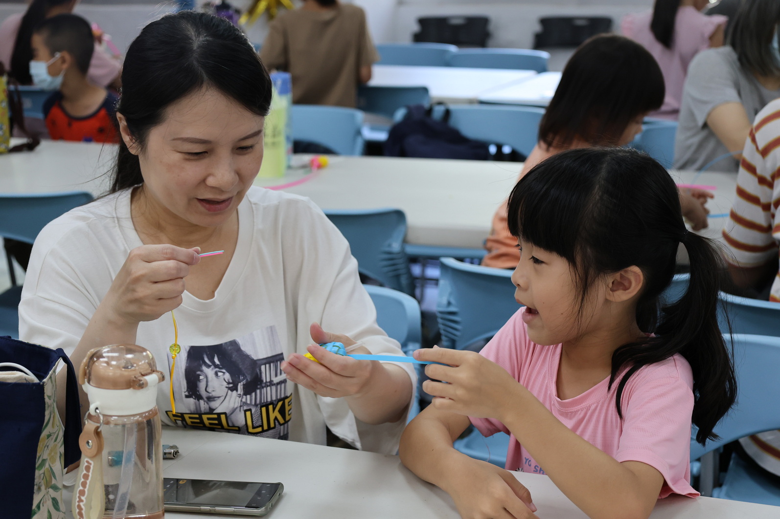 該場活動邀請擅長編織手工藝的鄭淑玲老師進行教學,鄭老師以循序漸進、淺白易懂的教學方法,帶領現場百餘位親子體驗編織手作,先以編織帶編織出玩偶身體及衣服,再加上繩子、圓珠及長珠,製作出玩偶的雙腳,最後黏上緞帶及單顆活動眼睛,可愛的卡通造型玩偶吊飾就完成了。