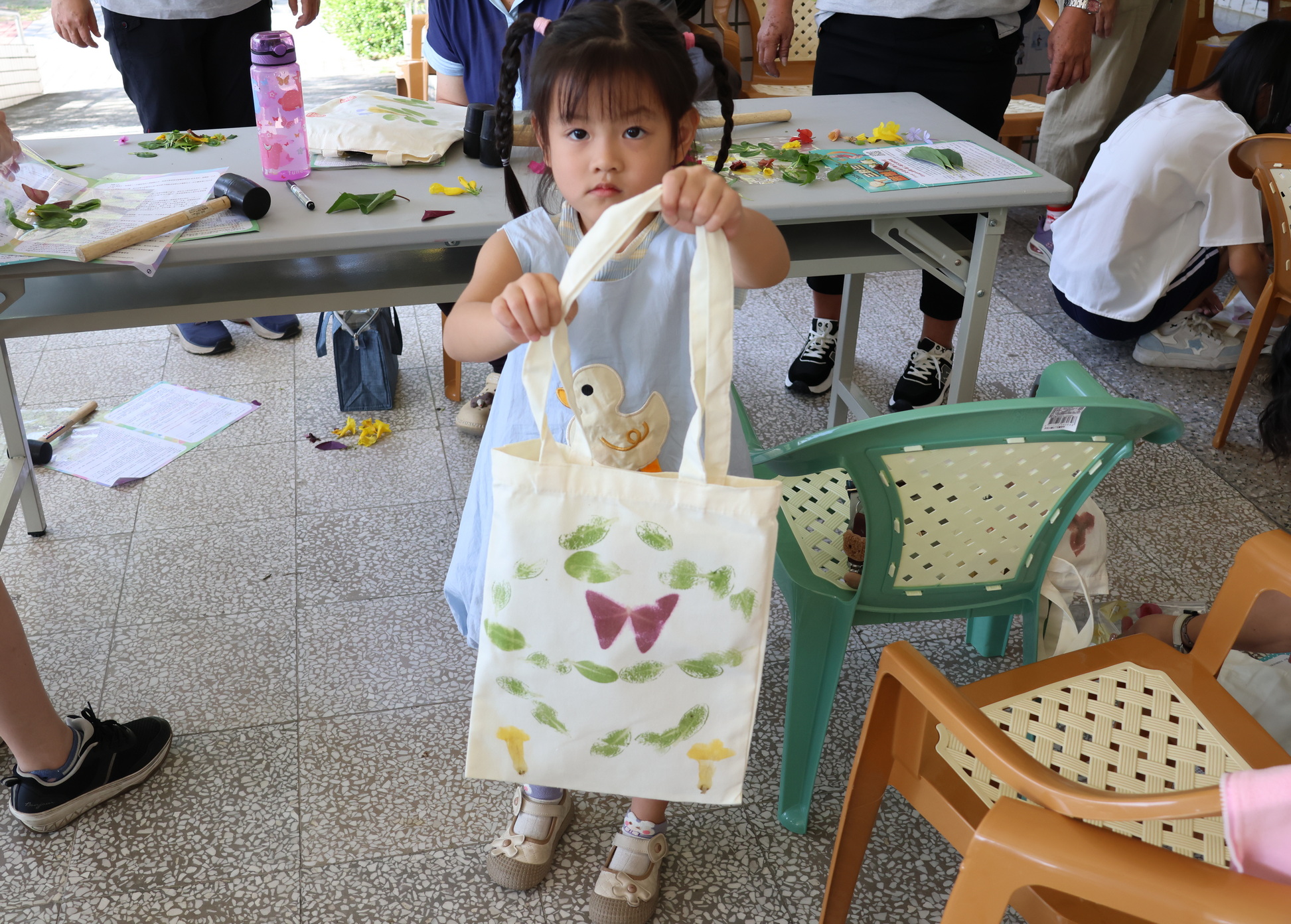 蕭老師細心引導大小朋友摘取材料時,只取少量所需即可,以維持植物旺盛的生命力,提倡人與大自然永續生存的理念。活動現場氣氛熱絡,笑聲不斷,許多家長表示,這樣的活動不僅讓孩子們學到課業以外的新體驗,也讓親子在生活中了解生態環境之美感。現場大小朋友認真敲打,百鎚齊下,敲染的叩叩聲不絕於耳,彷彿一場打擊樂盛會,大小朋友們發揮創造力,通力合作,製作出獨一無二的作品,完成時紛紛開心與其合影。