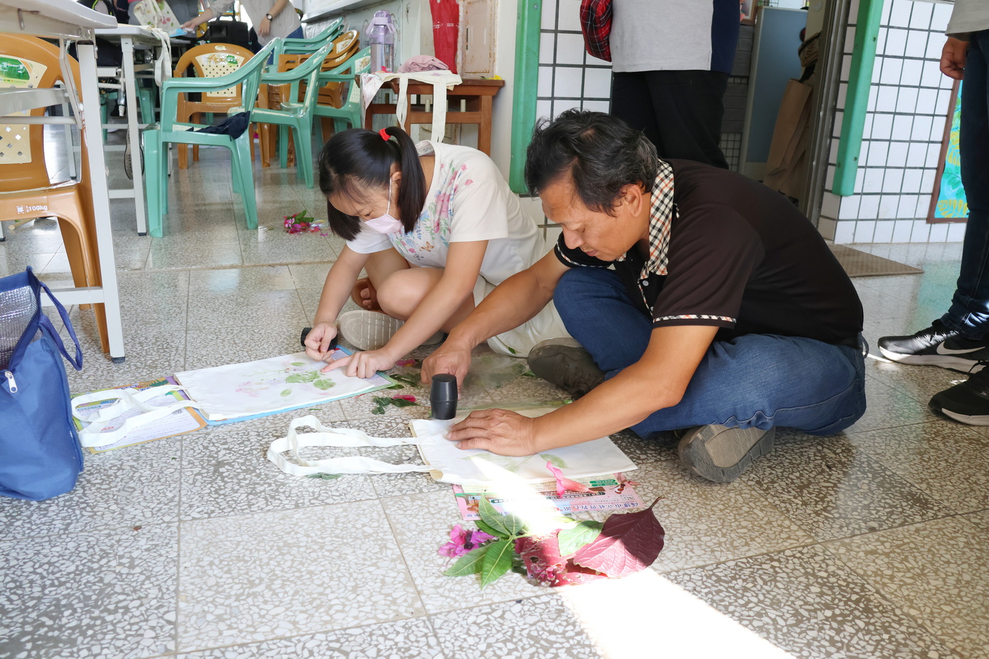蕭老師提醒大家,太多汁的葉片與花朵不適合敲染,因敲打時汁液會暈開,導致糊成一團。本次活動使用長春花、九重葛等天然植物作為染料,首先於素面手提袋底下墊一層報紙,然後擺放葉片或花朵,用鎚子或石頭輕輕敲打,直到汁液染至布面為止,但不能太過用力,否則葉片與花朵會糊爛且無法上色。將花葉的形狀及顏色敲染在手提袋之後,接著發揮創意加上手繪圖案,或於空白處題字、落款,再蓋上刻有祝福語的印章,可增添創作趣味。