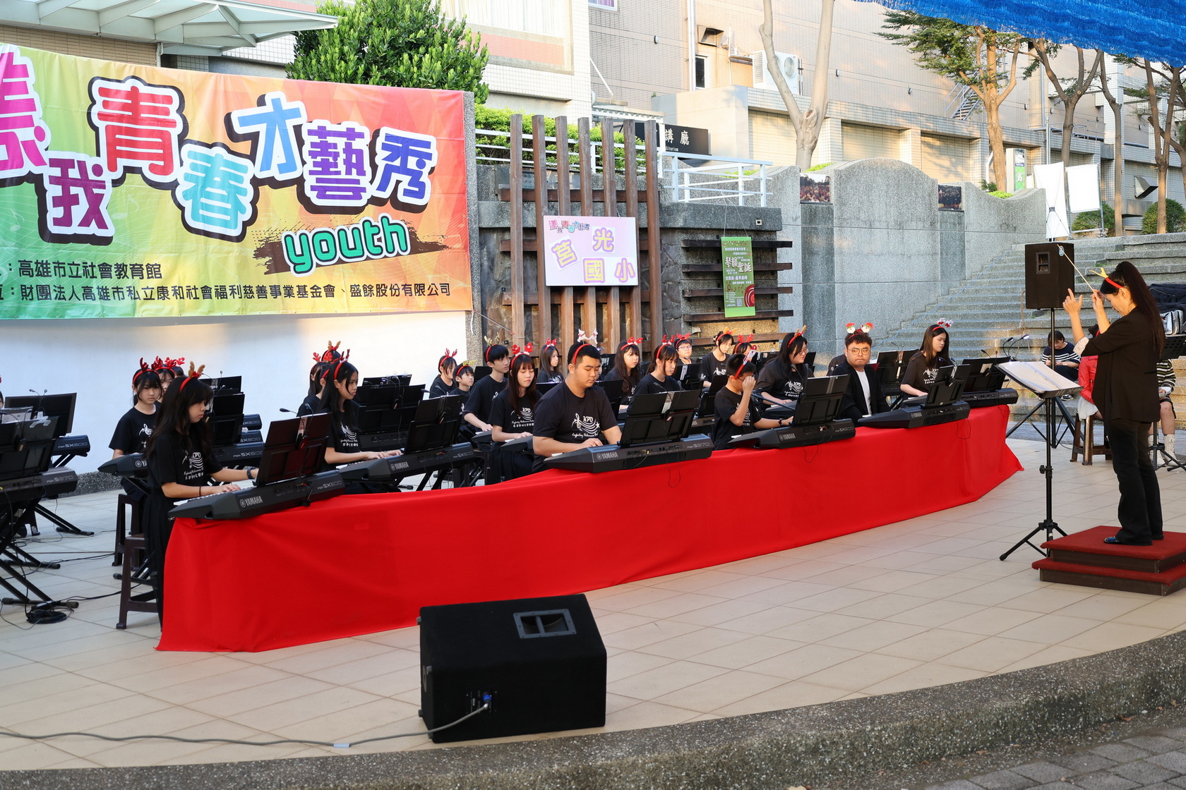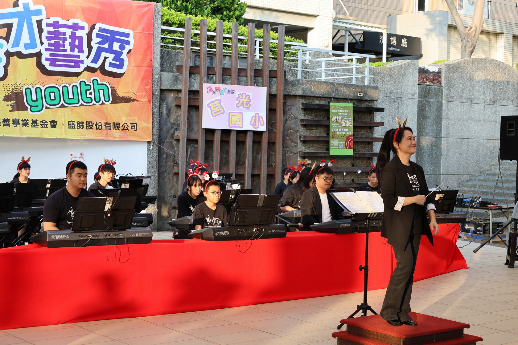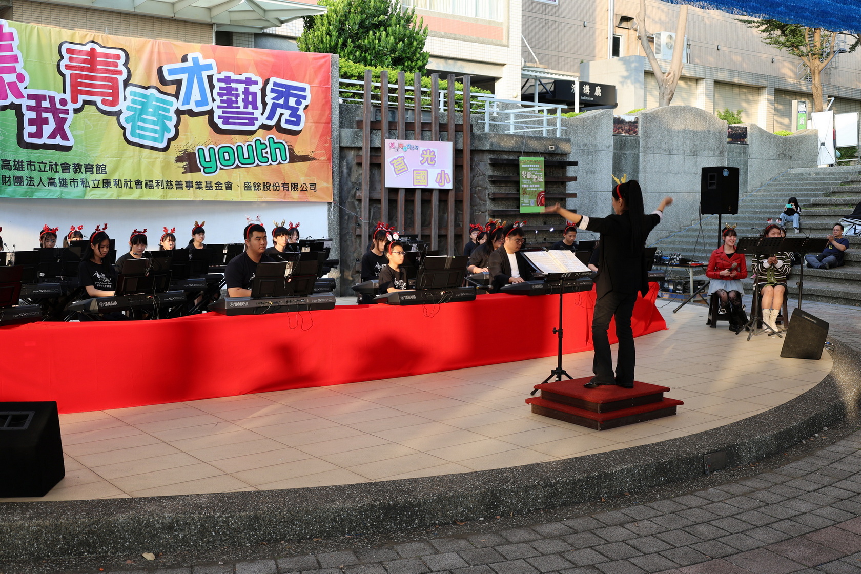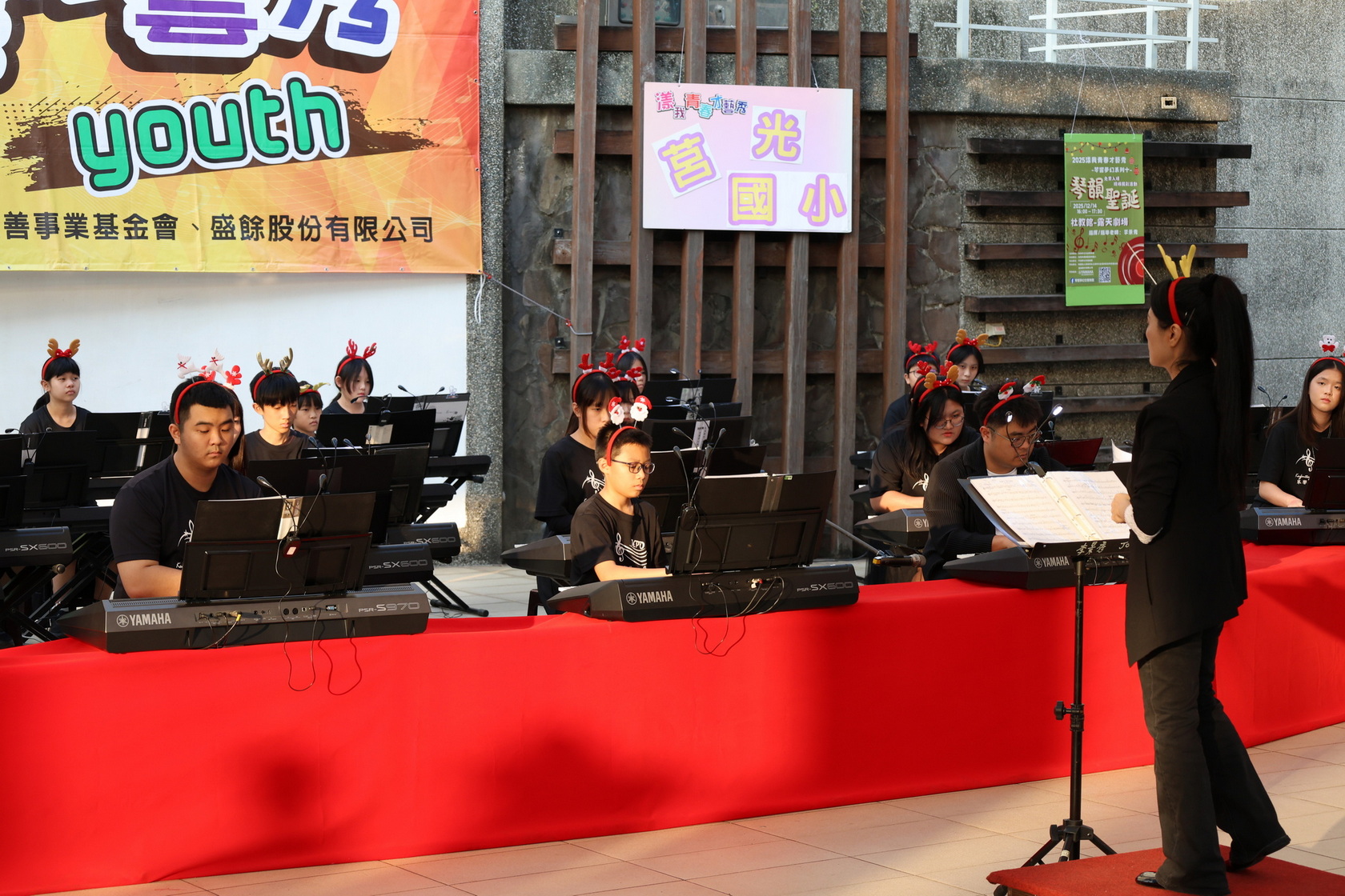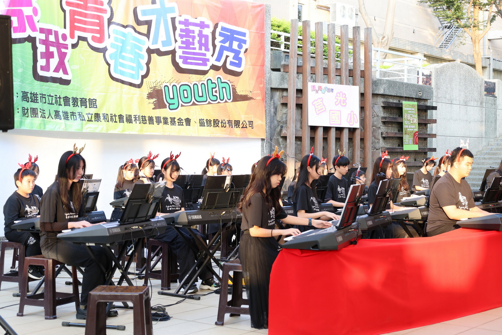 高雄市立社會教育館於12月14日下午在該館戶外露天劇場舉辦「漾我青春才藝秀~琴響夢幻系列十・琴韻聖誕」,邀請高雄市楠梓區莒光國小電子琴鍵盤社團擔綱演出。隨著聖誕節腳步接近,該校近40位小小團員以電子琴交織的多層次音場,化作動人的冬季樂章,為民眾帶來一場充滿節慶氛圍的音樂饗宴。社教館加碼摸彩活動,讓整場演出不僅音樂動人,更充滿驚喜與笑聲,洋溢著青春、節慶與藝文氣息。