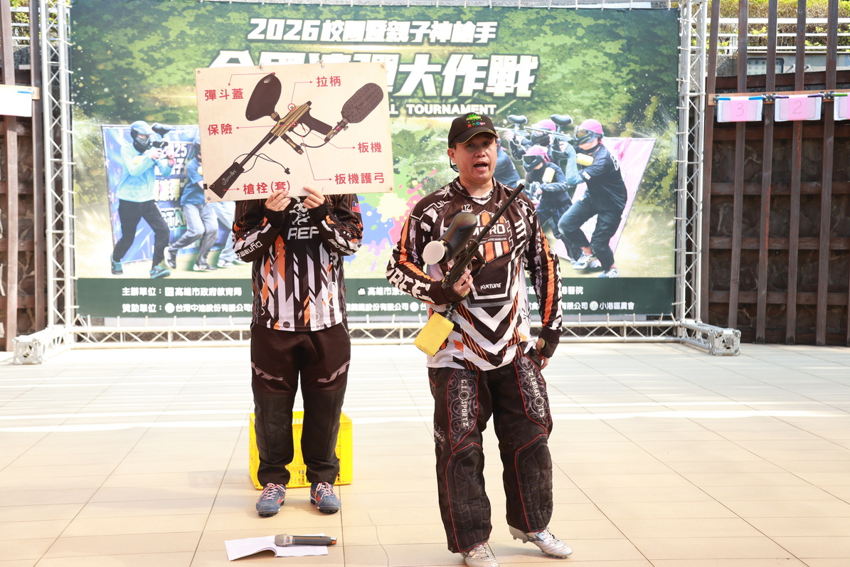 開幕典禮各組選手群英聚集,由高雄市政府教育局局長吳立森主持開幕式,吳局長率領社教館黃昭誌館長團隊,攜手高雄市漆彈推廣協會裁判群,以結合漆彈射擊元素之創意儀式揭開序幕,與會貴賓賴瑞隆立委、陳麗娜議員、張博洋議員、李順進議員服務處鍾主任、黃彥毓議員服務處洪副主任、蔡武宏議員服務處曾主任、中山工商李昱平校長、高雄市小港區農會盧振豪總幹事、小港醫院陳心怡護理師等共同射擊6面象徵標語帆布卷軸,包含【22屆全國漆彈大作戰】、【2026校園親子神槍手】、【漆彩繽紛熱血社教】、【菁英集結一觸即發】、【親子並肩勇敢出擊】、【團隊默契決勝關鍵】,象徵賽事邁入第22年的重要里程碑。