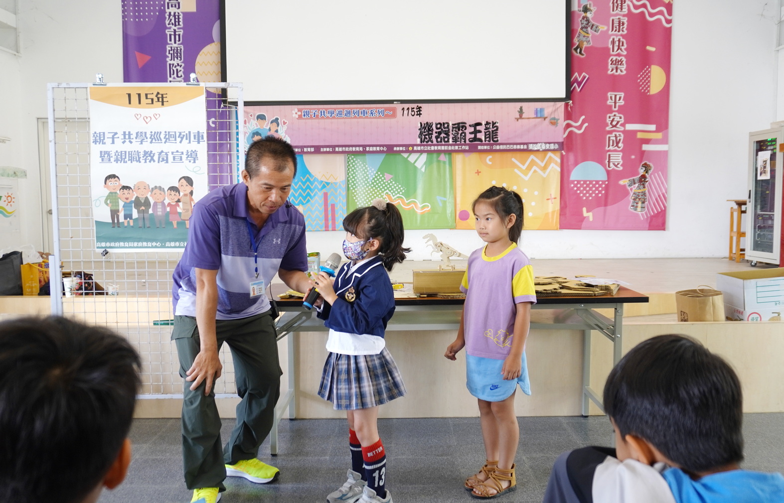 就讀彌陀區南安國小六年級的梁懿廷同學,因爸媽上班無法同行,由叔叔及嬸嬸陪同前來參加活動,梁同學表示:「平常很少有機會接觸這樣的課程,透過這次的活動,自己親手組裝,讓機器霸王龍動起來,感覺非常開心!期待下次還能來參加這樣的活動。」;而家住楠梓區的陳巧芸及陳巧萱兩姊妹由媽媽陪同參加活動,陳小妹妹表示: 「用彩色筆幫機器霸王龍著上顏色,感覺更漂亮了! 」活動現場氣氛熱絡,笑聲與討論聲此起彼落,展現出學習的熱情與活力。